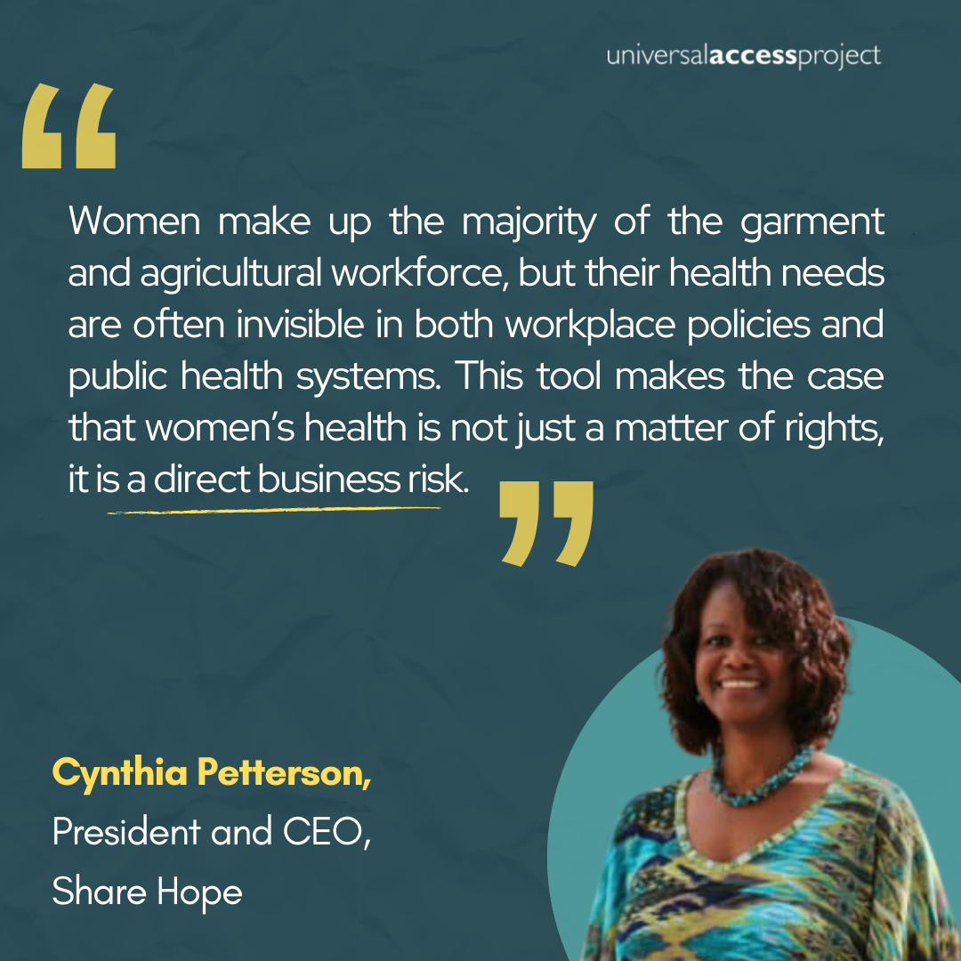 This was not built in isolation. It was developed by the Accountability Platform for Women’s Health and Empowerment in Global Supply Chains, a network managed by the Universal Access Project that includes businesses, researchers and civil society organizations working together to advance needed worker health and wellbeing policies and practices at workplaces and in global supply chains. With the Platform as the convening arena, the tool was shaped by experts across sectors and continents: Health system specialists, reproductive health leaders, labor rights advocates, CSR practitioners, and supply chain researchers all contributed. Many have decades of experience working directly with garment and agricultural workers in Asia, Africa, and Latin America. That collective expertise ensured the tool is rigorous, grounded in lived realities, and relevant for businesses navigating global due diligence requirements.